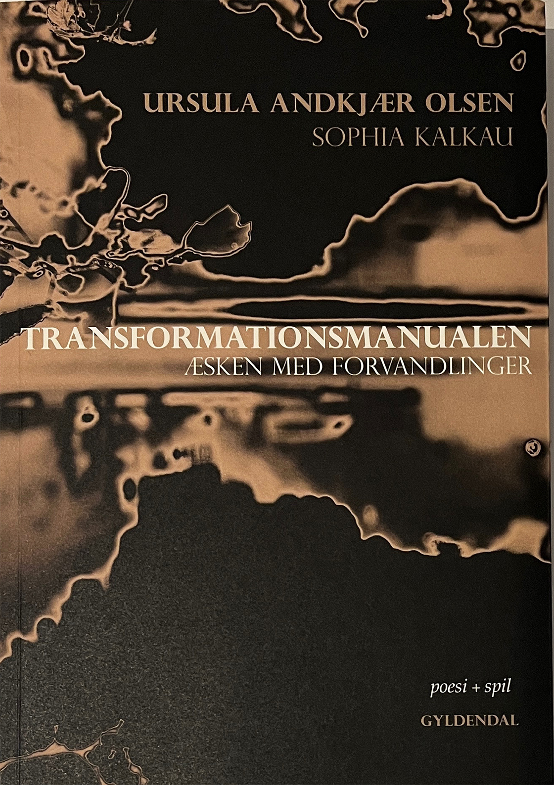 Forvandlingspoesi “Transformationsmanualen’ og ‘Æsken med Forvandlinger’ er digter Ursula Andkjær Olsen og billedkunstner Sophia Kalkaus dobbeltværk, en bog og et sæt nummererede billedkort. Kalkaus mystiske billedserie gennemløber en cyklus, årets gang; det samme forløb som Andkjær Olsens digtbog følger og gennemløber tre gange, som en dagbog ført hen over tre år. I noter, digte, mikroessays, eventyr – og billedmystik – fremkaldes en transformation: En mobilisering og radikalisering. En omprogrammering af tankebaner og handlemønstre. En bevægelse ud af isolation, billedløshed og handlingslammelse.” — ursulaandkjaerolsen.dk