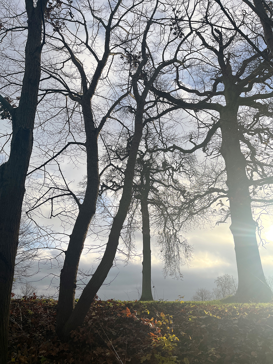 I skovbunden blade. Brune krøllede. Svampe. Bær på nøgne vintergrene.